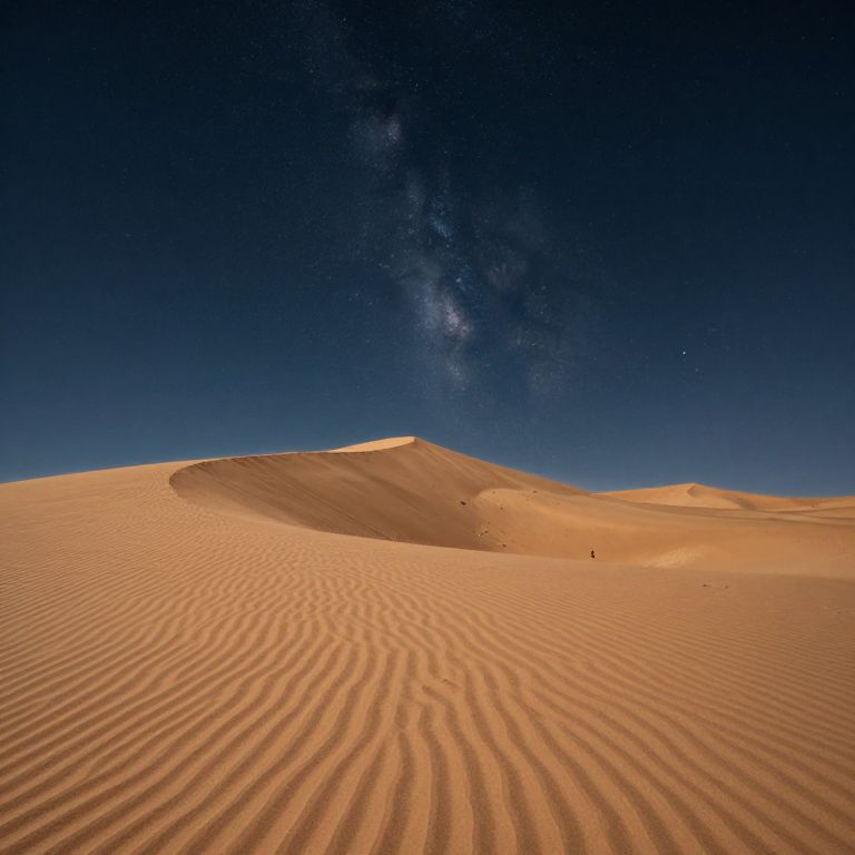 In the quiet embrace of the desert, where each ripple of sand whispers the infinite dance of time, the cosmos above mirrors the soul's journey—lonely yet boundless, eternally seeking connection beneath the starlit expanse.