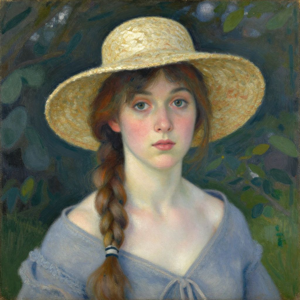 This is a digital painting of a young white girl with fair skin and brown eyes, wearing a straw hat with a black band, a blue denim shirt over a white blouse, and a long braid tied with a white hairband. The background is an impressionistic blend of dark greens and purples with blurred floral shapes. The girl's expression is neutral, and her cheeks are slightly flushed. The painting's style combines realism with impressionism, emphasizing soft textures and gentle colors. The girl is centered in the frame, with the hat casting a subtle shadow on her face.