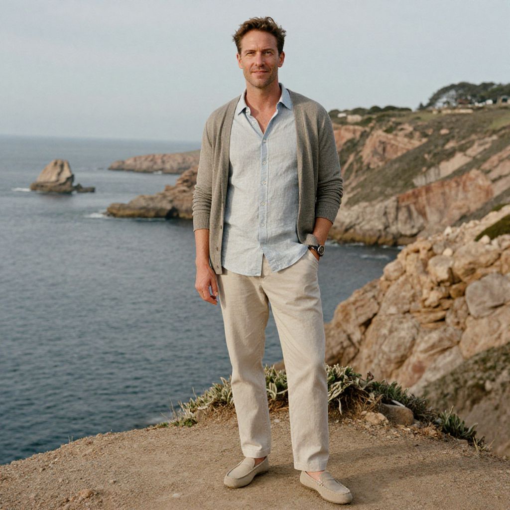 A man, casual linen button-up shirt, lightweight cotton chinos, comfortable slip-on loafers, soft cotton blend cardigan, muted earth tones, coastal cliffs, ocean breeze, rugged shoreline, ib technicolor film stock, relaxed smile, enjoying the view. Man has masculine face and piercing eyes