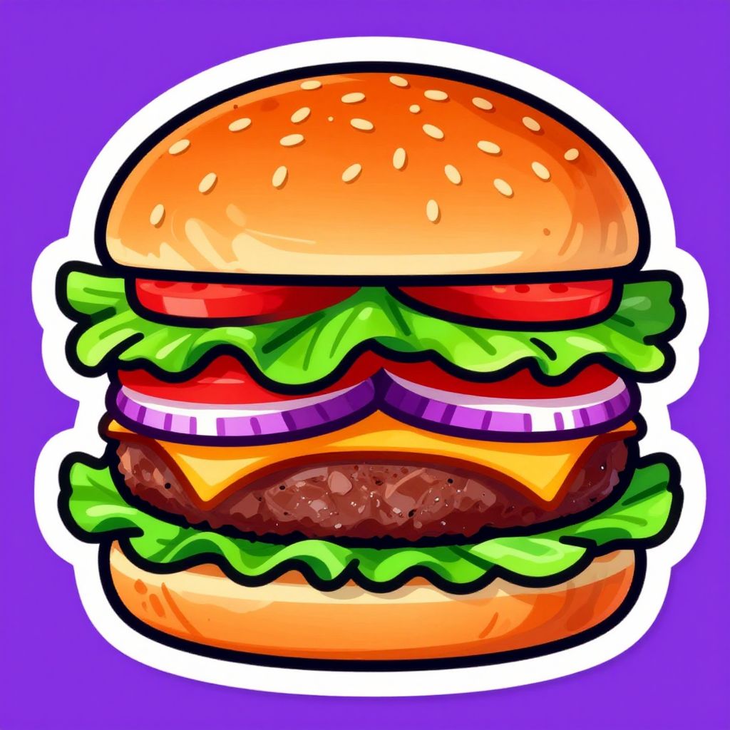Vibrant pop art style illustration of a double cheeseburger with lettuce, tomato, onion, cheese, and sesame seed bun. The image features bold outlines and a retro aesthetic with bright colors against a purple background, designed as a digital sticker.