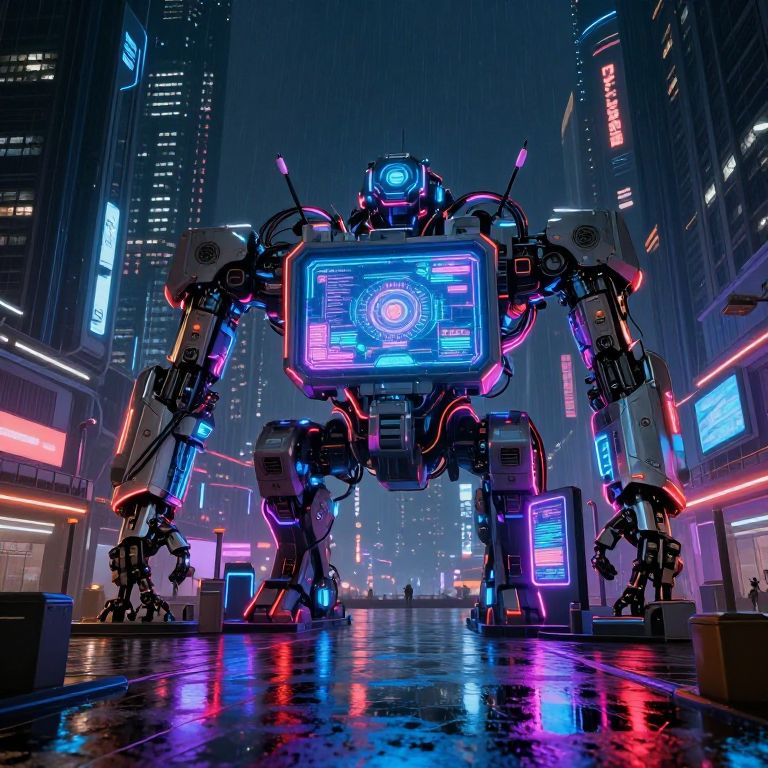 A digital CGI image depicting a futuristic, neon-lit cityscape at night. Dominating the scene is a large, robotic mecha with glowing blue and purple LED lights, standing on a wet, reflective street. The mecha's central chest displays a holographic interface with a circular blue light. Surrounding buildings have bright neon signs in various colors, including pink and white. The background shows tall skyscrapers with numerous illuminated windows. The overall style is cyberpunk, with a focus on vibrant, contrasting lights and a high-tech, sci-fi aesthetic. The mecha's metallic texture contrasts with the glossy, wet street surface.
