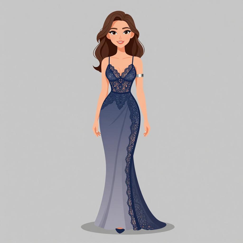 Digital illustration of a smiling woman with long, wavy brown hair, wearing a form-fitting, floor-length, dark blue lace gown with a plunging neckline and spaghetti straps. The dress features a subtle gradient from dark blue at the top to light blue at the hem. She stands against a plain, light blue background, with her left arm slightly raised and her right arm by her side. Her skin tone is light, and she wears a small black bracelet on her right wrist. Her makeup is subtle, with a hint of pink on her lips. The illustration has a clean, modern, cartoon style.
