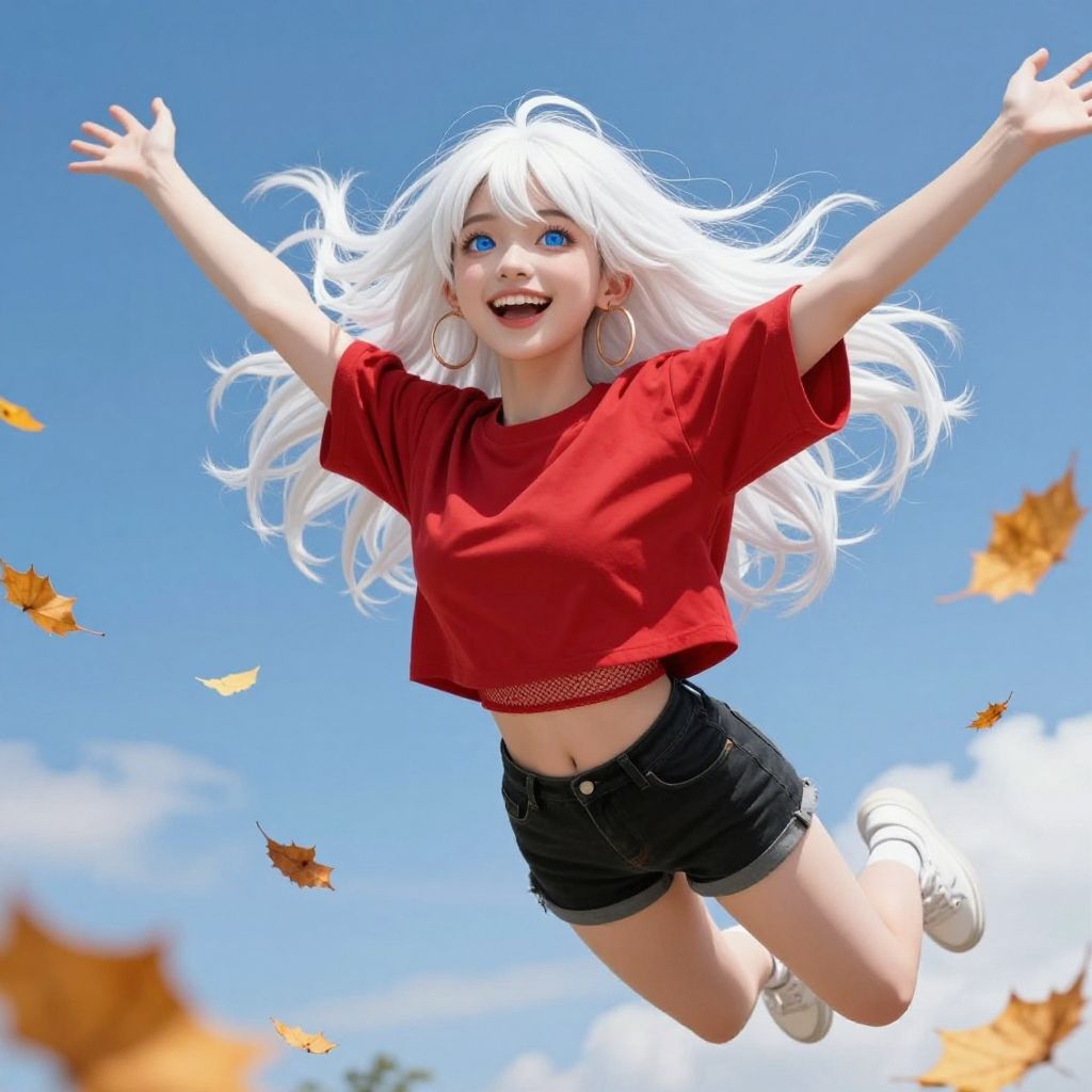 Photograph of a young woman with long, white, flowing hair jumping joyfully against a clear blue sky. She wears a red, short-sleeved, mesh crop top and black, high-waisted, frayed denim shorts, with white socks and black sneakers. Her arms are outstretched, and she is smiling broadly. Surrounding her are several orange and brown autumn leaves, seemingly in mid-air. The bright sunlight highlights her fair skin and vibrant outfit, creating a lively and carefree atmosphere. The image captures a sense of freedom and happiness.