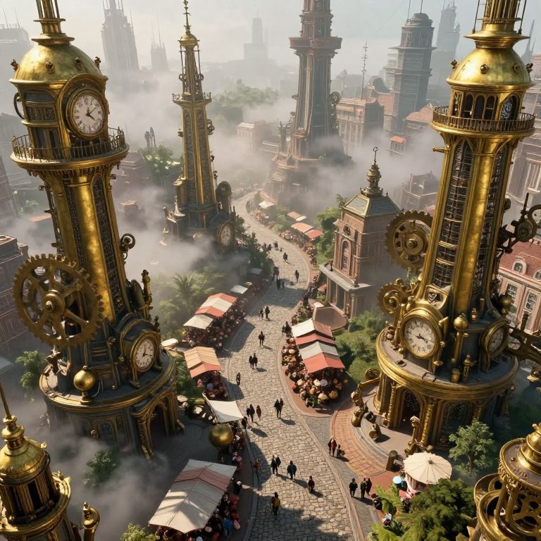 A surreal steampunk cityscape emerges from an aerial viewpoint, showcasing winding cobblestone streets and vibrant marketplaces teeming with activity below. Towering brass structures intertwine with clockwork automatons, creating a harmonious fusion of technology and nature that captivates the viewer's imagination. Gears and cogs seamlessly merge with the architecture, evoking both awe and curiosity within this fantastical world. The atmosphere is shrouded in swirling mist and steam, casting ethereal shadows on the intricate metalwork and enhancing the surreal ambiance of this unique landscape.