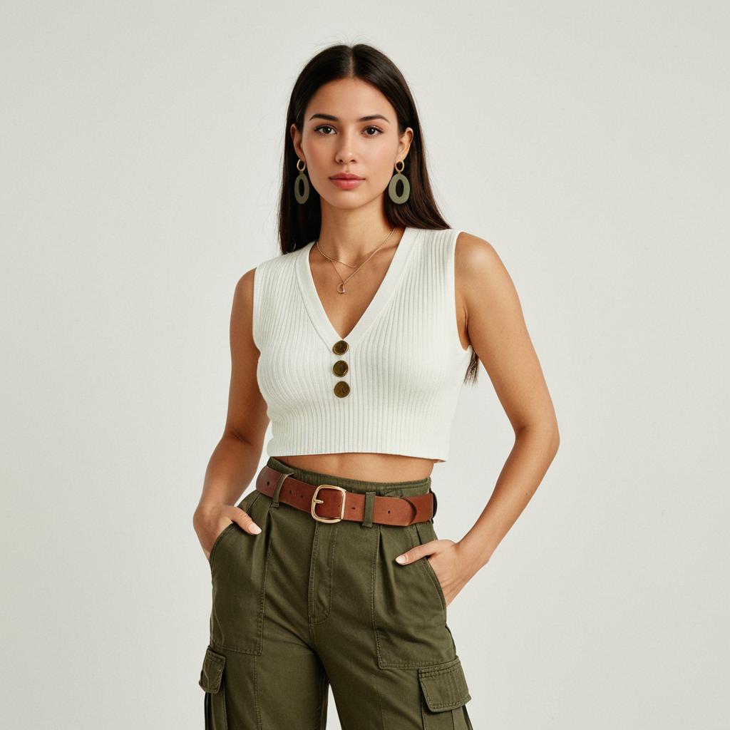 Portrait of a young woman wearing a white ribbed knit sleeveless crop top with a deep V-neckline and three decorative buttons. She pairs it with high-waisted olive green cargo pants featuring large pockets and a brown belt with a simple buckle. She accessorizes with statement green oval earrings and a delicate gold necklace. The photo is taken in a white studio background.