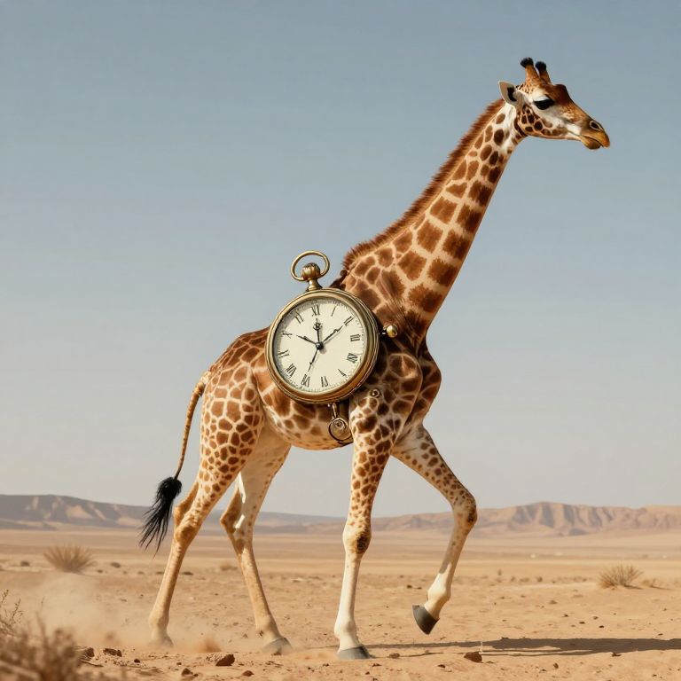 In a surreal digital artwork, a clockwork giraffe strides through a barren desert landscape, its body seamlessly integrated with a large pocket watch, symbolizing the fusion of time and nature in a fantastical, high-definition rendering.