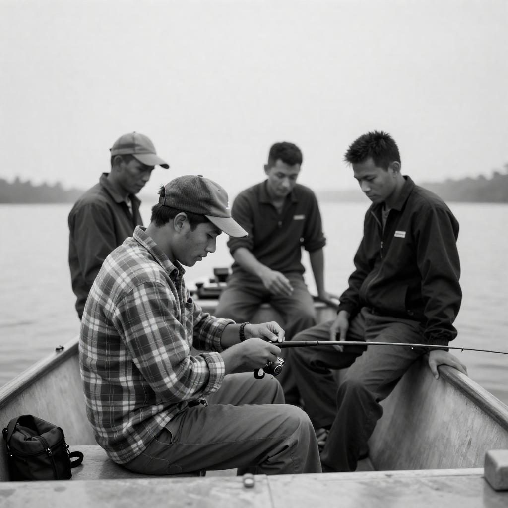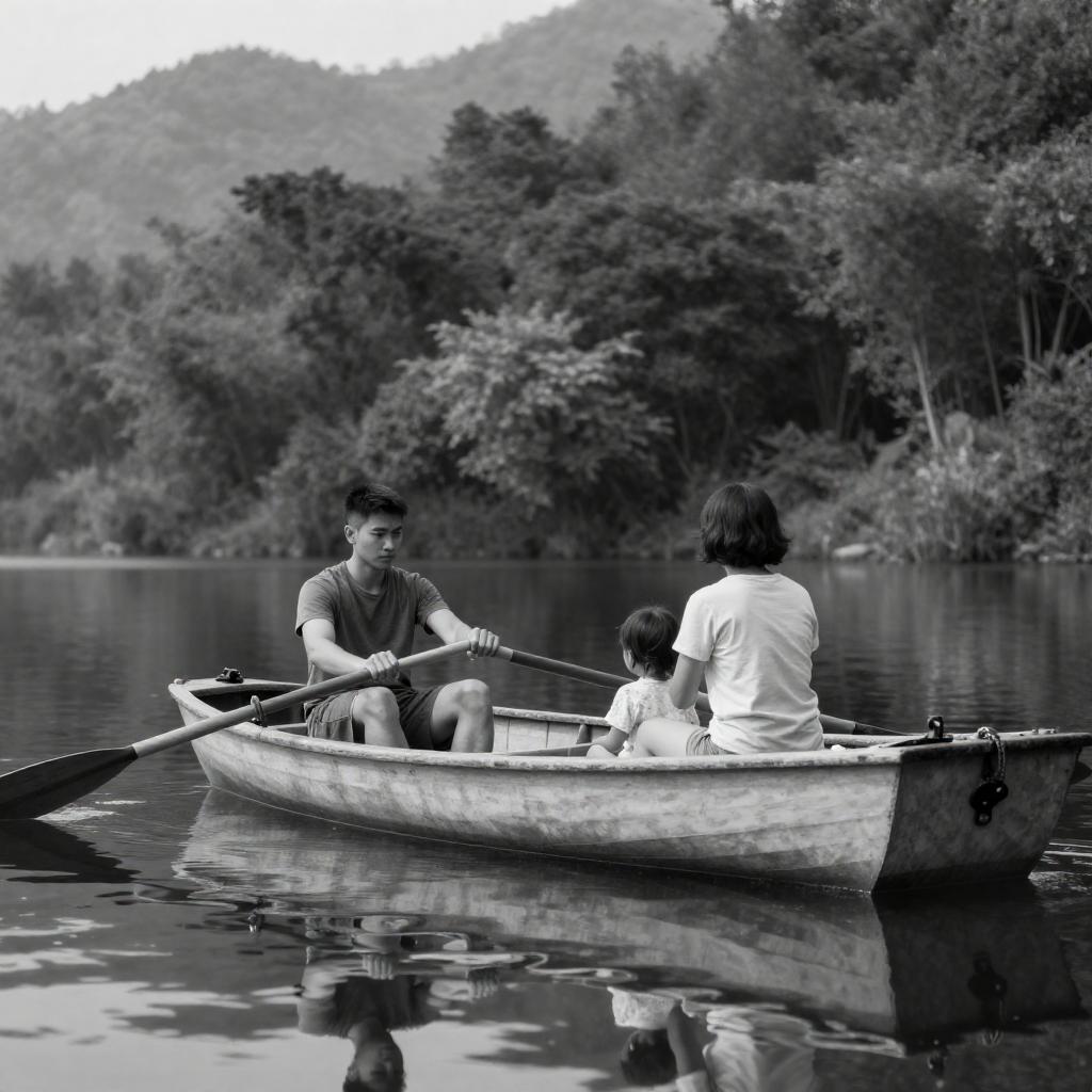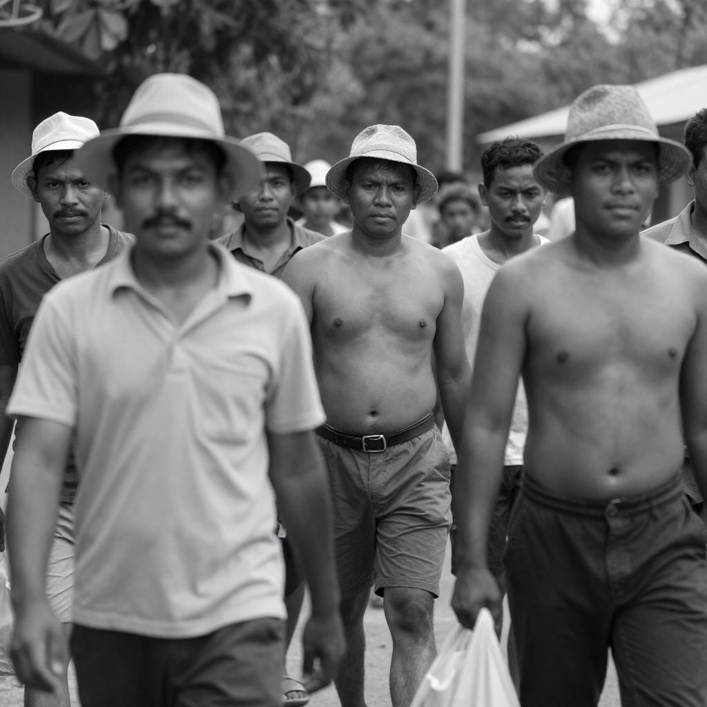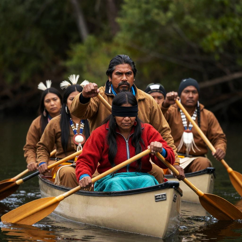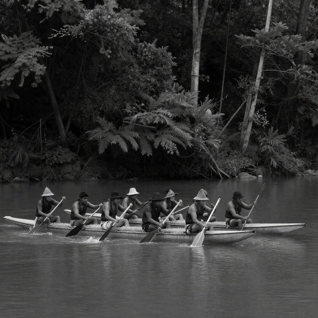 Black-and-white photograph of indigenous people paddling traditional canoes with grass mats on a calm river. Seven individuals, wearing dark clothing and hats, row in unison, creating ripples in the water. Dense forest with tall trees lines the background. The image captures the synchronized motion and natural setting.