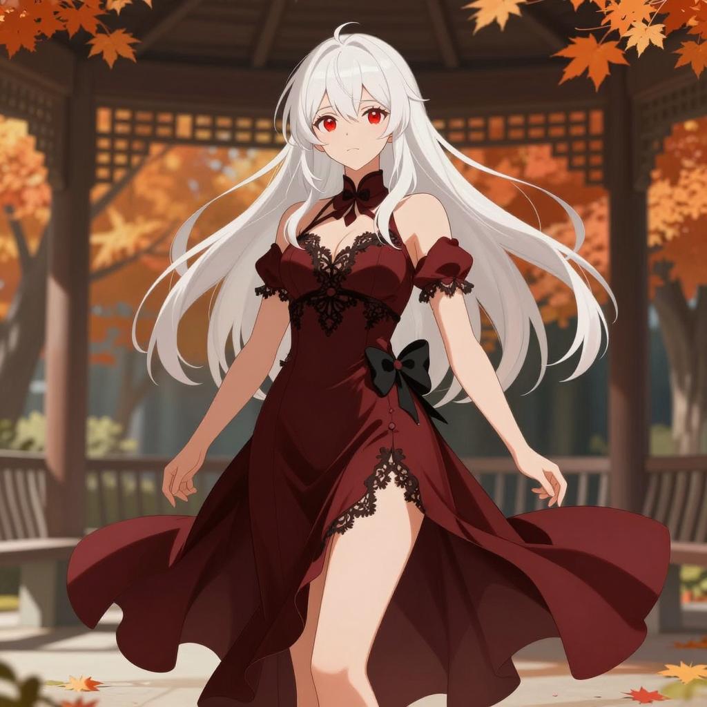 Anime-style illustration of a confident woman with long white hair and red eyes wearing a flowing, elegant dark red dress with black lace details. She poses gracefully in an outdoor pavilion surrounded by autumn trees with orange foliage.