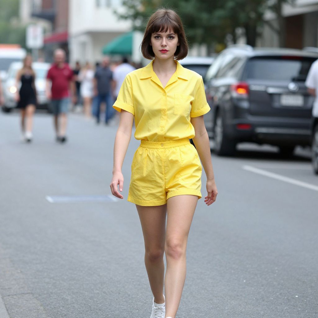 Photograph of a young woman with fair skin and straight brown bob-cut hair, walking down a city street. She wears a bright yellow short-sleeved polo shirt and matching yellow shorts, paired with white sneakers. Her expression is neutral, with red lipstick adding a pop of color. The background shows a blurred urban setting with people, parked cars, and buildings. The street is paved and lined with greenery and storefronts. The overall style is casual and modern.