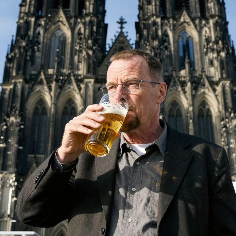 Alex Delarge High resolution Photo of Walter White sitting in front of the Cologne cathedral drinking a beer with beautiful sunshine,