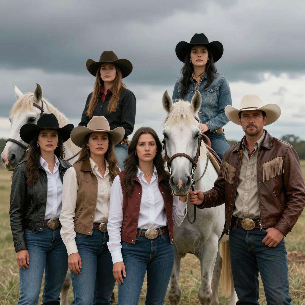 Photograph of five people in Western attire, standing outdoors with a white horse. Four women and one man. Women wear cowboy hats, jackets, and shirts. Man wears a white hat, leather jacket, and fringed vest. Woman on horse's back. Dark, cloudy sky in background. Horse's head on left. Women stand in front, man to the right of horse. All look serious.