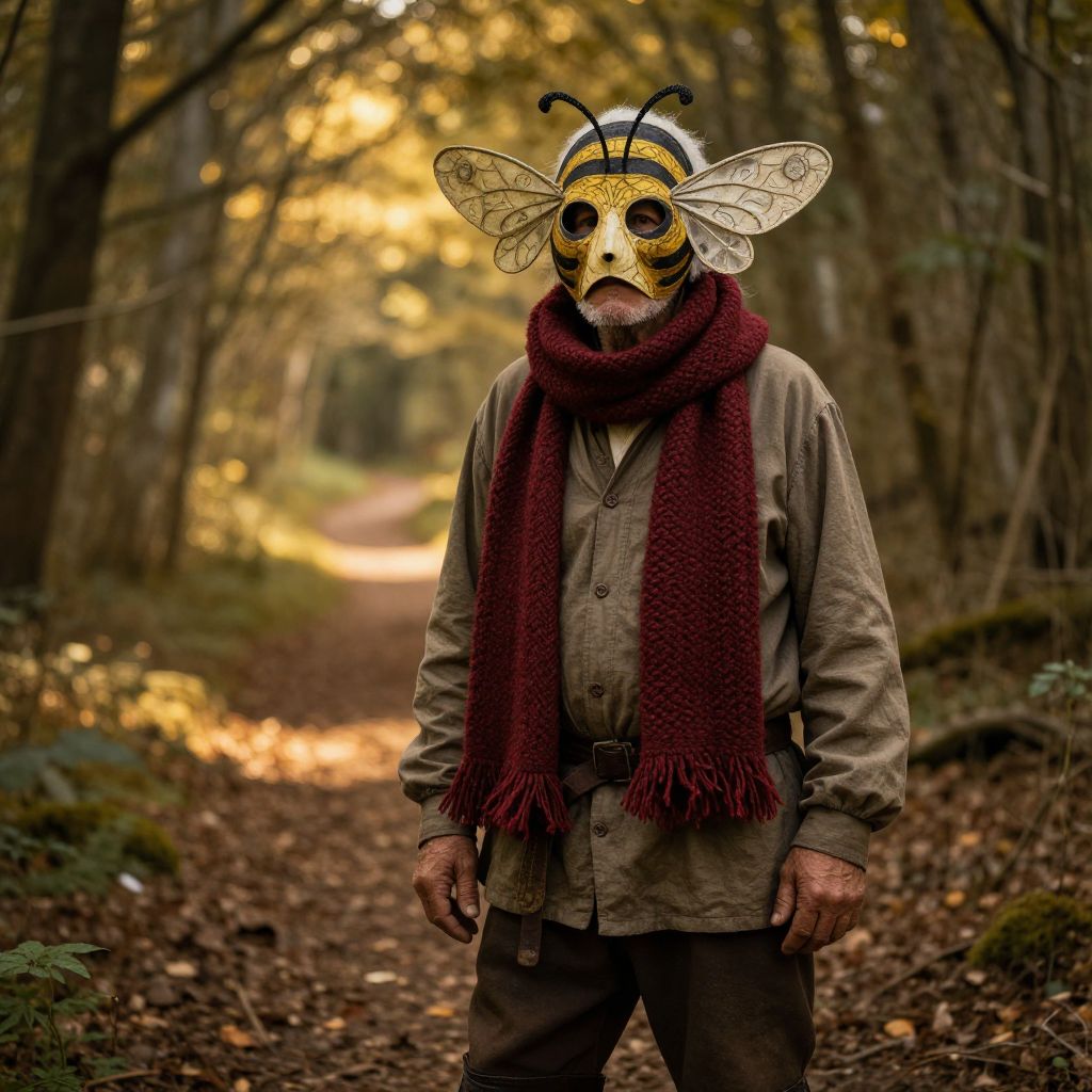 An old man with a bee mask on his head and a scarf around his neck, wearing a long-sleeved shirt and a pair of boots, standing in a forest clearing with a sunlit path in the background, the mask is detailed with intricate patterns resembling a bee's wings, the scarf is made of thick, woven fabric with a deep red color, the man's face is partially obscured by the mask but his eyes are visible and intense, the scene is illuminated by warm golden light filtering through the trees, creating a mystical and serene atmosphere, the overall style is realistic with a touch of fantasy elements.