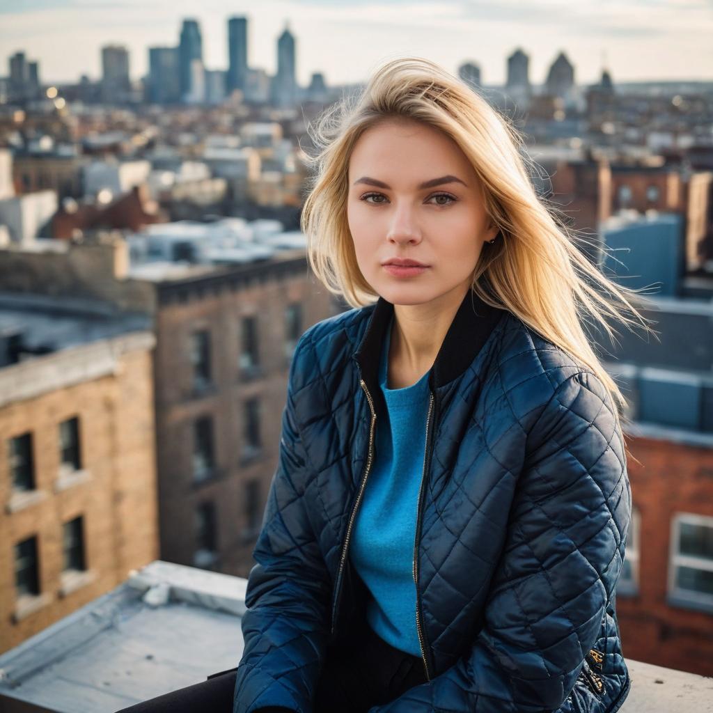 A young woman with blonde hair wearing a black quilted jacket and blue shirt sits on an urban rooftop edge overlooking a busy city street filled with traffic, behind her are old city buildings with warm tones, natural daylight with soft shadows, shallow depth of field focusing on the woman with blurred busy street background