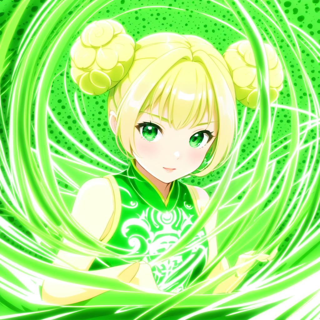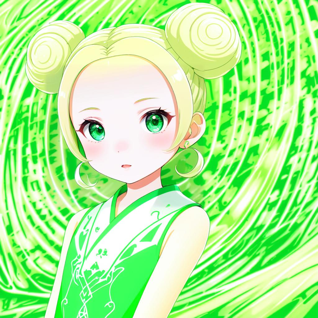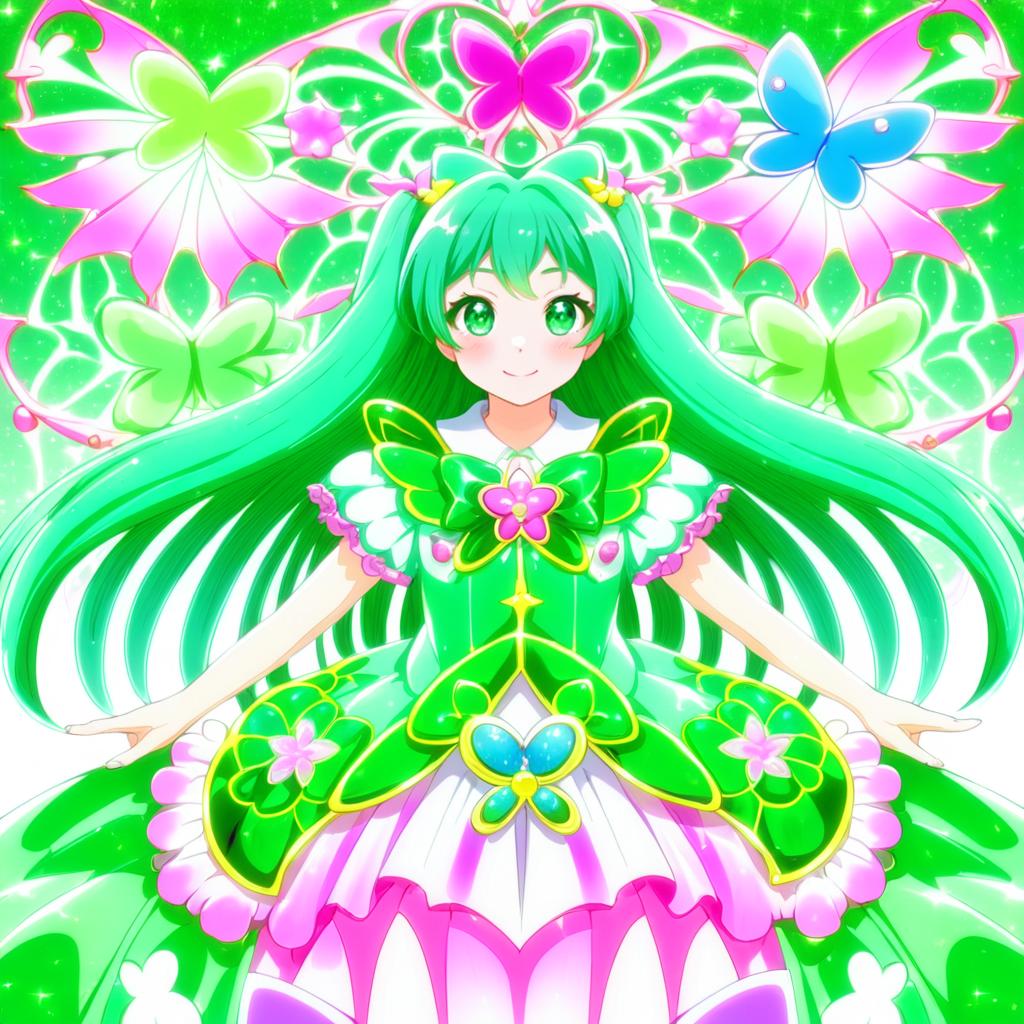 Anime-style illustration of a magical girl with long green hair and green eyes wearing a vibrant green and white dress adorned with butterfly and floral motifs. The character has a butterfly brooch on her chest and a radiant background filled with green and pink butterflies, emphasizing a bright, magical theme.