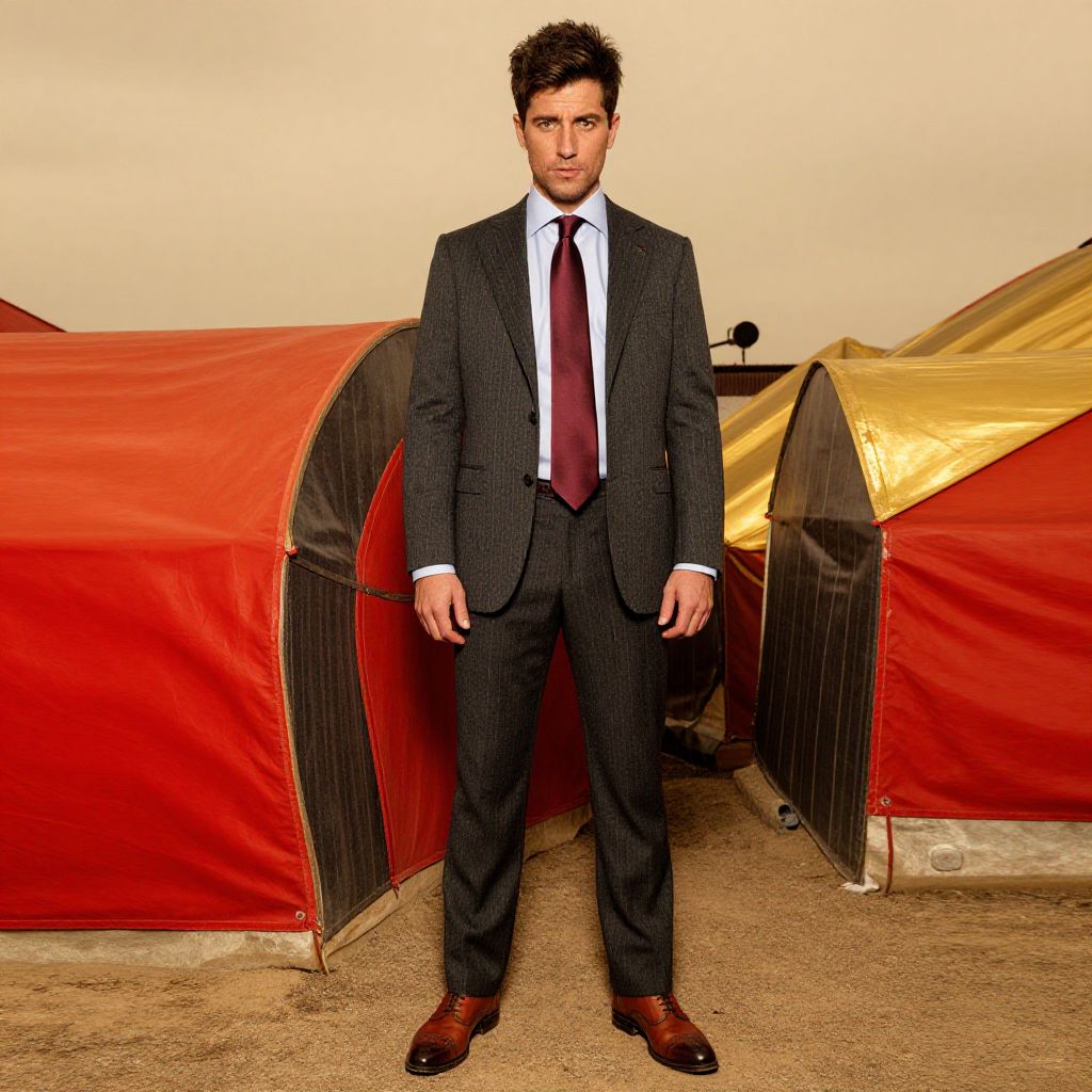 A man, charcoal gray pinstripe suit, light blue dress shirt, burgundy silk tie, brown leather brogues, vibrant red and gold roofs, sepia effect, confident expression Man has masculine face and piercing eyes