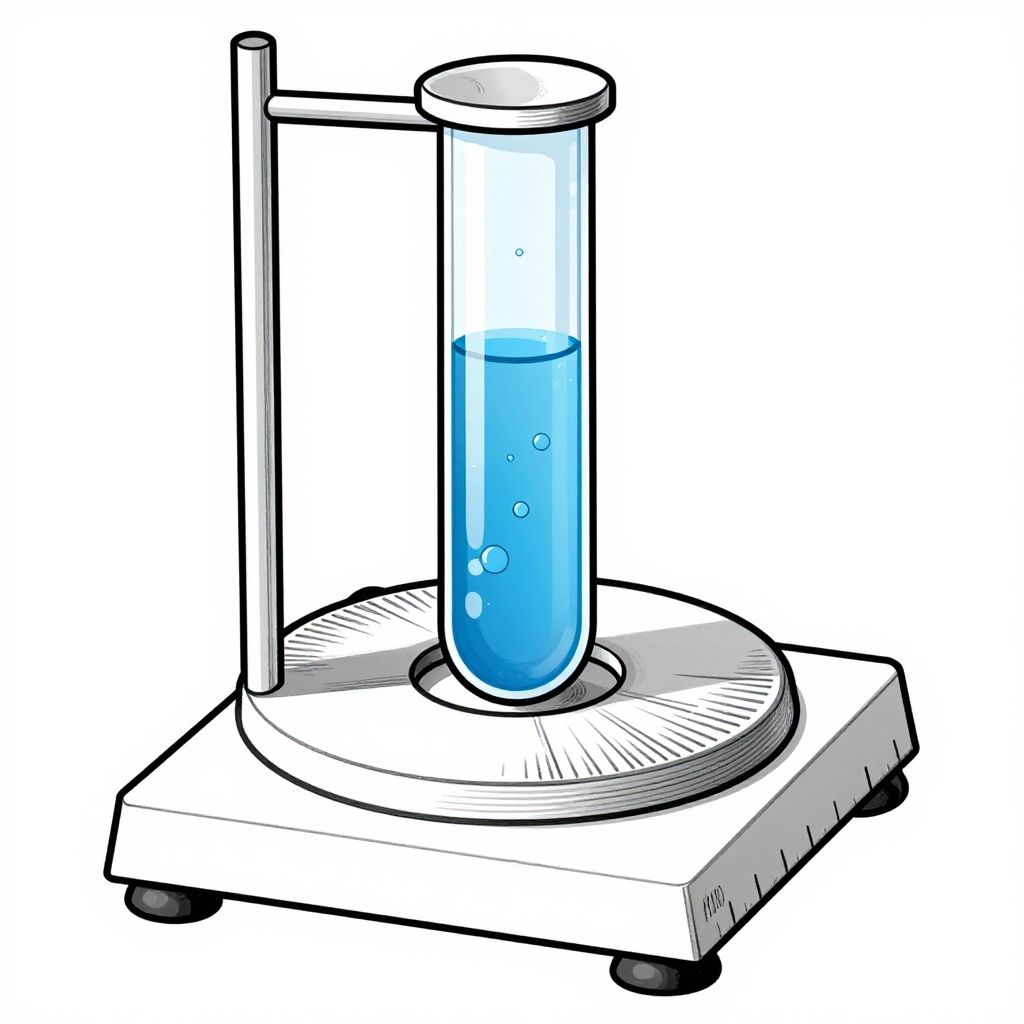 Digital illustration of a glass beaker with a black-capped test tube containing a pink liquid, set on a white laboratory base.