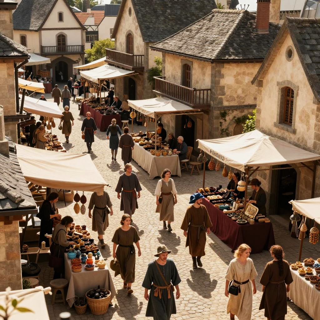 From.up shot of a bustling marketplace in a medieval fantasy town, colorful stalls with exotic goods, villagers in period clothing, cobblestone streets, intricate architectural details, warm sunlight and dynamic shadows
