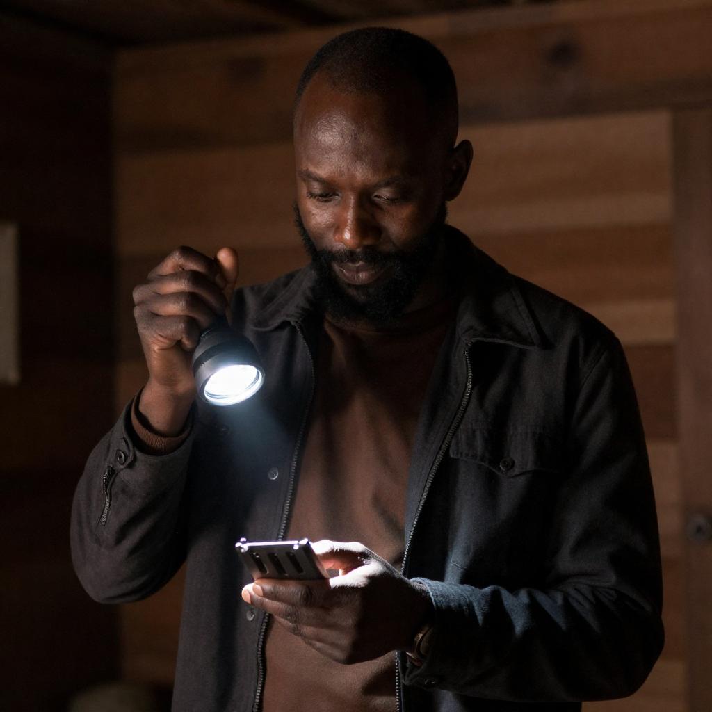 Photograph of a serious-looking Black man with short hair, wearing a brown jacket, holding binoculars, standing behind a large, twisted tree in a dense, bright green forest. His intense gaze is directed at the camera. The background is blurred with sunlight filtering through the leaves.