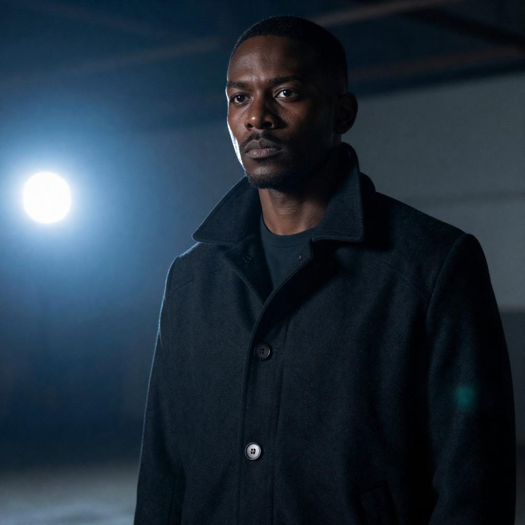 Portrait of a serious Black man with short hair wearing a brown jacket and holding binoculars. He stands between two tree trunks in a dense, sunlit forest with a blurred green background. The man looks directly at the camera with an intense gaze.