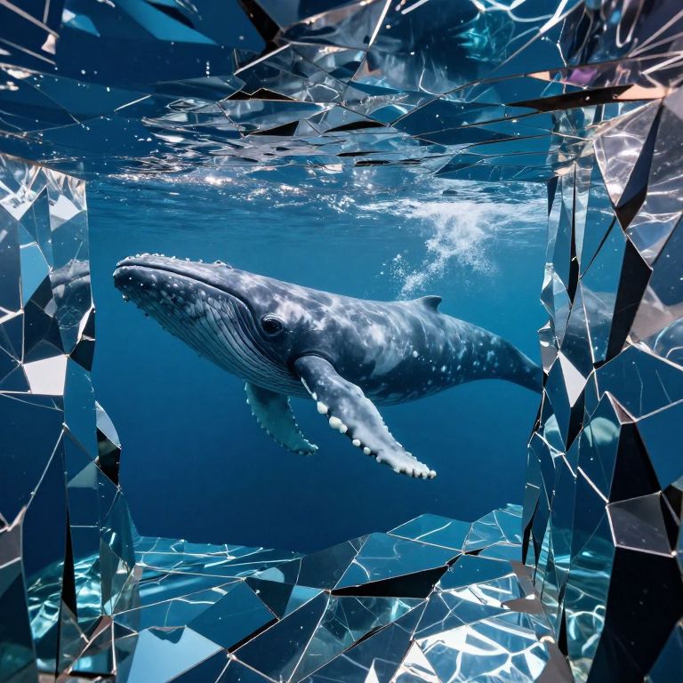 A majestic whale glides through an underwater corridor lined with jagged, mirror-like walls that shatter light into endless reflections, creating a surreal, infinite tunnel of fragmented realities.