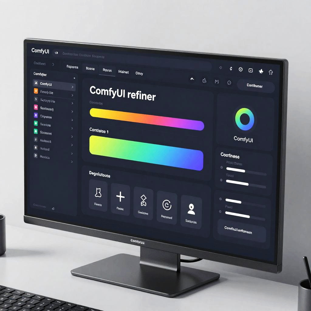 A close-up view of the ComfyUI refiner dashboard integrated into a high-tech creative studio, featuring smooth touch controls, vibrant color gradients, dynamic progress bars, and artistic icons, all presented in a clean, modern digital environment.