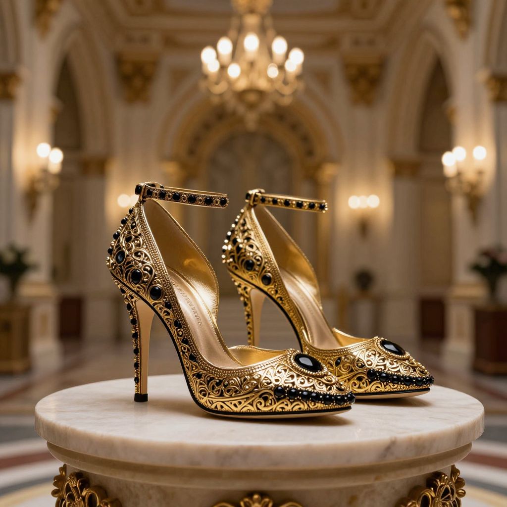 Elegant armor heels made from gold and black steel, decorated with filigree patterns and gemstone accents, displayed on a pedestal in an ornate castle chamber, with warm ambient lighting highlighting the craftsmanship and regal design.