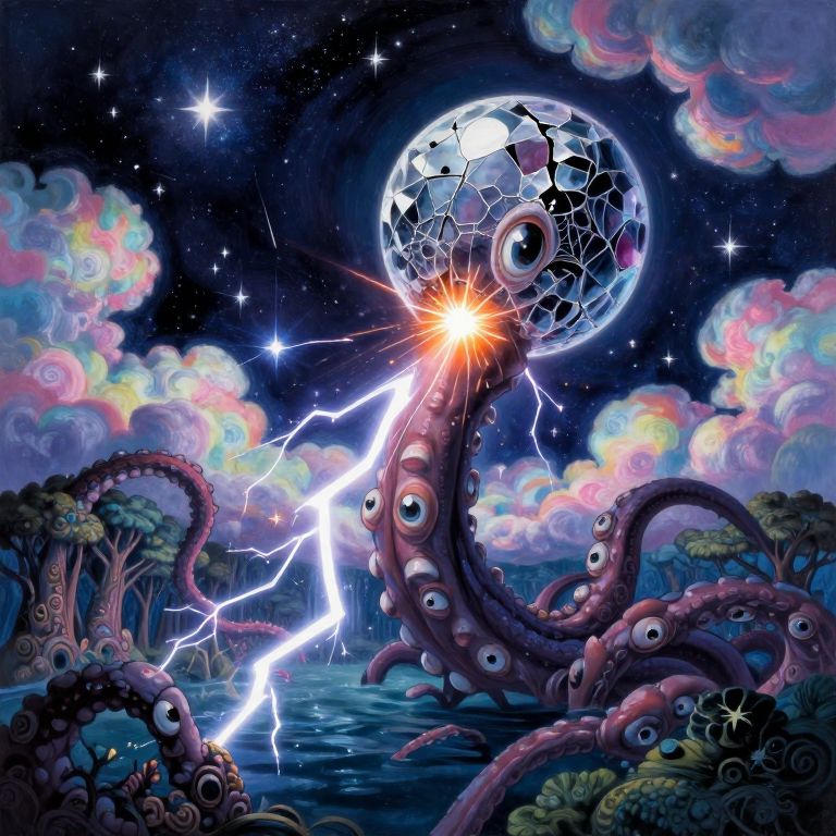 This digital illustration showcases a surreal, night-time scene with a large, mosaic-tiled planet emitting bright light and electricity, positioned centrally. A massive, tentacled creature with multiple eyes and purple, textured skin coils around the planet, with lightning bolts striking from its body. The background features a starry sky, colorful, swirling clouds, and a dark, reflective water surface. On the bottom left, more tentacled creatures are partially submerged in the water. The overall style is vibrant and fantastical, with a blend of sci-fi and fantasy elements, using rich, dark blue and purple hues.