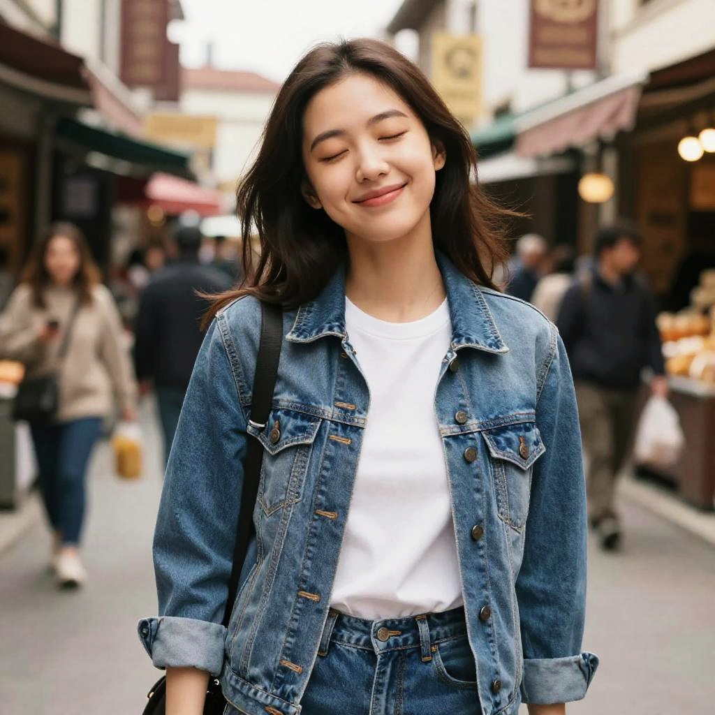 Hyper realistic lifelike texture dramatic lighting unrealengine trending on artstation, award winning photo, nikon RAW photo, 8 k, Fujifilm XT3, masterpiece, best quality, realistic, photorealistic, ultra detailed, extremely detailed face, solo, 1girl, closed eyes, posing for a picture, casual yet stylish, denim jacket over white t-shirt, jeans, smile, amidst a bustling street marketirene1