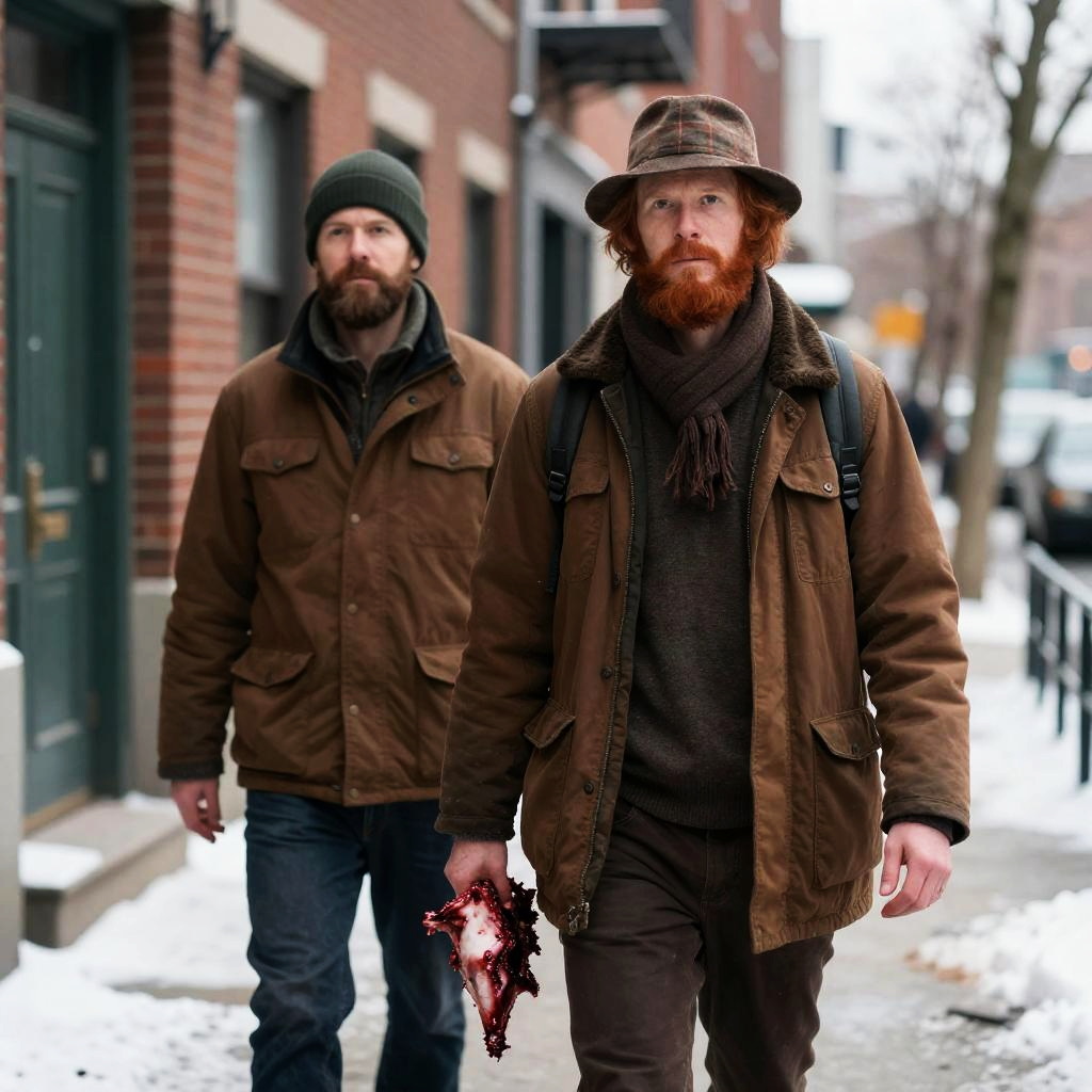 Photograph of two men standing on a snowy urban sidewalk. The man on the right, with a brown plaid hat and scarf, holds a bloody, dismembered animal carcass in his right hand. Both have red hair and beards, wear brown winter clothing, and look ahead with serious expressions. Background includes brick buildings with green doors and a railing on the right. Snow covers the ground. The man on the left stands slightly behind the man on the right.
