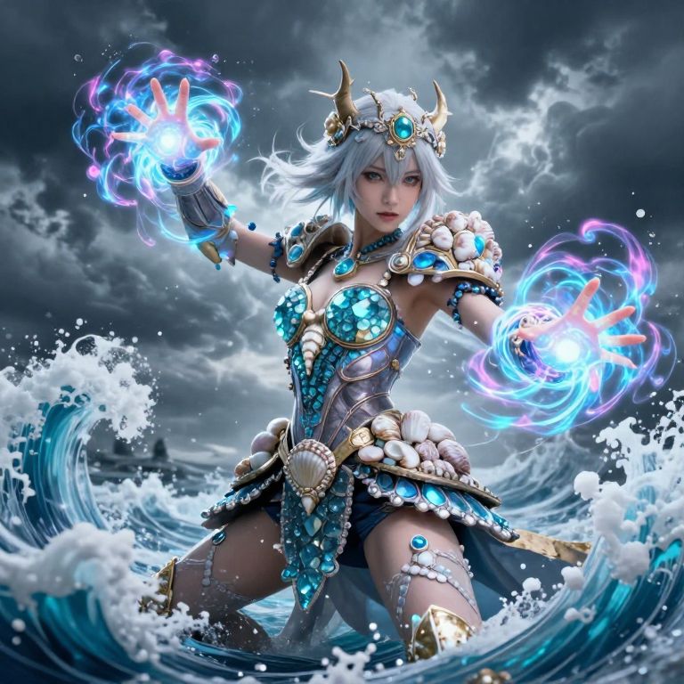 Portrait of Furuna as a powerful elemental sorceress commanding tidal waves, her hands glowing with iridescent energy, wearing an ornate armor made of shells and sea glass under a stormy sky, dynamic composition full of movement and magical intensity.