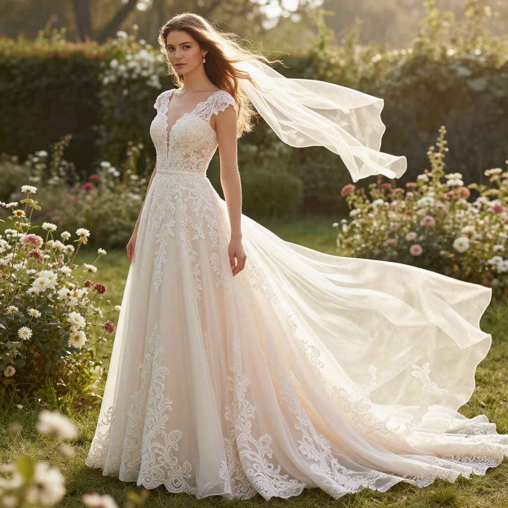 Gal Godot wedding dress inspired, elegant and ethereal bridal gown with flowing silk fabrics, delicate lace details, soft pastel hues, intricate embroidery, set in a sunlit garden with blooming flowers and gentle breeze, romantic and dreamy atmosphere.