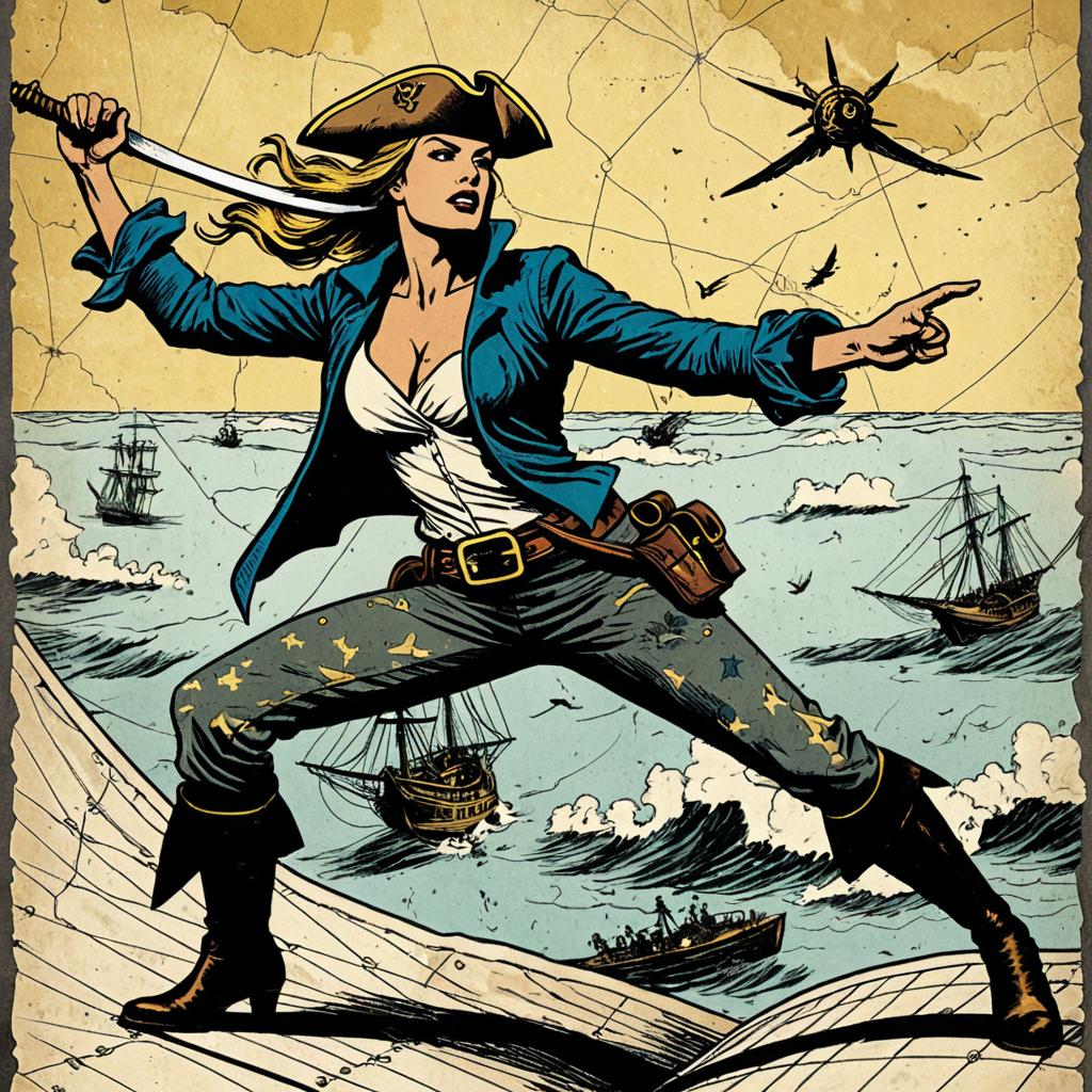 A retro comic book depiction of daring sky pirate, illustrated on a weathered nautical map with a muted color palette featuring gold highlights. She appears in a dynamic action pose, conveying a sense of adventure and bravery.
