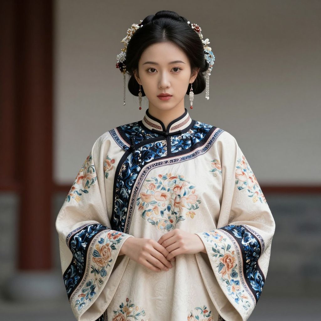 Chinese attire female, 1girl, solo, black hair, chinese clothes, jewelry, earrings, hair ornament, dress, realistic, standing, looking at viewer, wide sleeves, asian, own hands together, long sleeves
