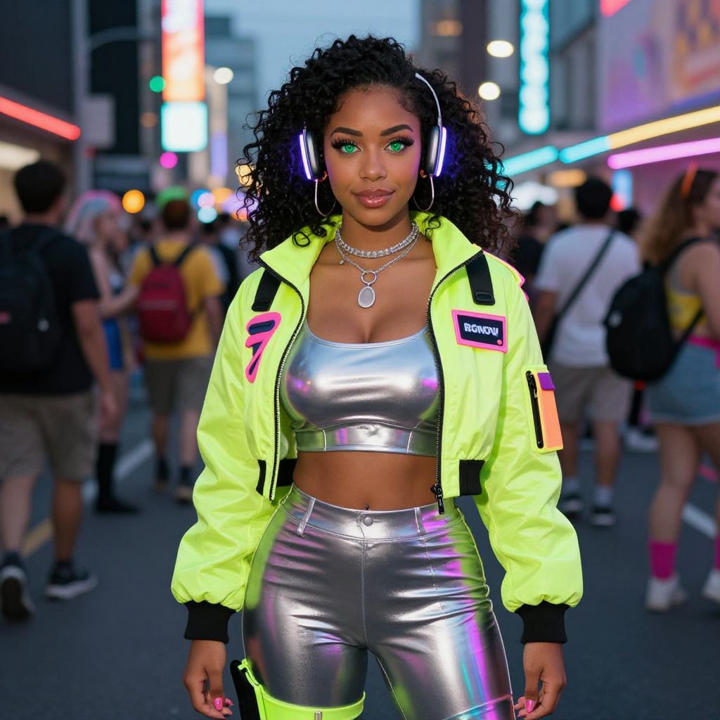 Photograph of a young Black woman with curly, voluminous black hair wearing large, silver headphones. She has bright green eyes with heavy makeup and full lips. She's dressed in a neon yellow bomber jacket with black and pink accents, over a silver metallic crop top and matching high-waisted pants. She also wears a silver necklace with a circular pendant. The background shows a crowded urban street at night with colorful neon signs and blurred figures. The scene is vibrant and energetic, with her outfit and the neon lights creating a striking contrast.