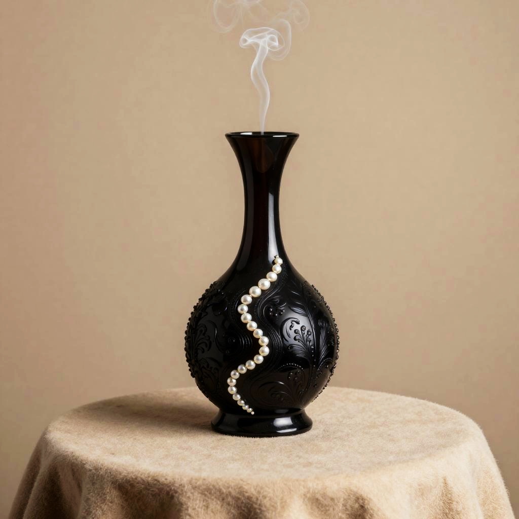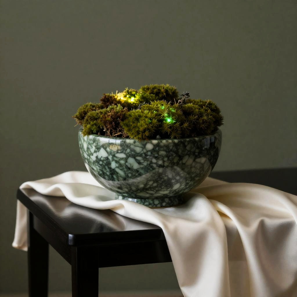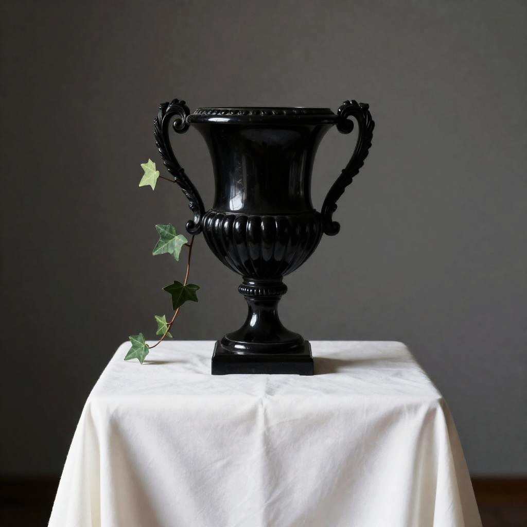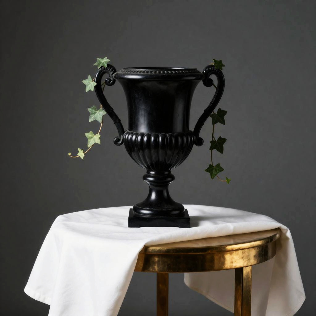 A sculptural vase featuring vibrant flowers, elegantly placed on a table draped with a deep blue cloth. The backdrop is a soft grey, captured in the iconic style of Ansel Adams, emphasizing a luxurious and sophisticated aesthetic. This still life exudes elegance, perfect for a high-end magazine, with hyper-detailed realism in stunning 8K resolution.