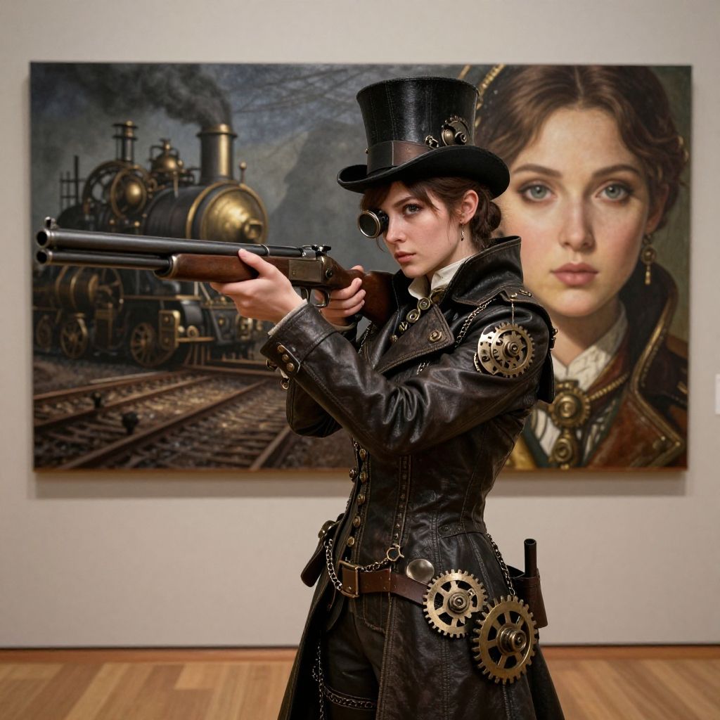 Hyperrealistic art (professional photo of a artistique painting showing a painting:1.4) with In a world where steam-powered engines drive progress, a steampunk huntress takes center stage. Dressed in a high-collared leather trench coat and adorned with an assortment of gears and chains, she points her elegantly crafted long gun towards a lurking shadow. The rhythmic clinking of metal accompanies her, emphasizing the fusion of Victorian aesthetics and futuristic innovation. With a top hat perched atop her head and a monocle affixed, she embodies the relentless pursuit of justice in a steampunk realm where shadows yield to the glow of brass and the hiss of steam., (masterpiece:1.3), (extremely intricate), (photorealistic:1.4), (extremely delicate), (ultra realistic:1.3), CG unity, 8k wallpaper, HDR, RAW photo, dslr, front lighting, fantasy, elegant, lifelike, photorealistic, digital painting, (realistic skin texture, soft light, sharp:1.2), crisp image, sharp image, clear image, vivid image, noiseless image, (((clean skin, neat skin, perfect skin))), (very beautiful young female face:0.8), (high detailed skin texture, intricate face), (highly symmetric proportions:0.6), perfect teeth, (sharp_pointed_nose:0.6), high detailed eyes, intricate eyes, cute female face, ((Highly symmetrical composition)), (hanging on a wall in an modern museum in a neutral room:1.2), (Wide shot taken with a Nikon D850 and Nikon AF-S NIKKOR 105mm f/1.4E ED lens), photographic, realism pushed to extreme, fine texture