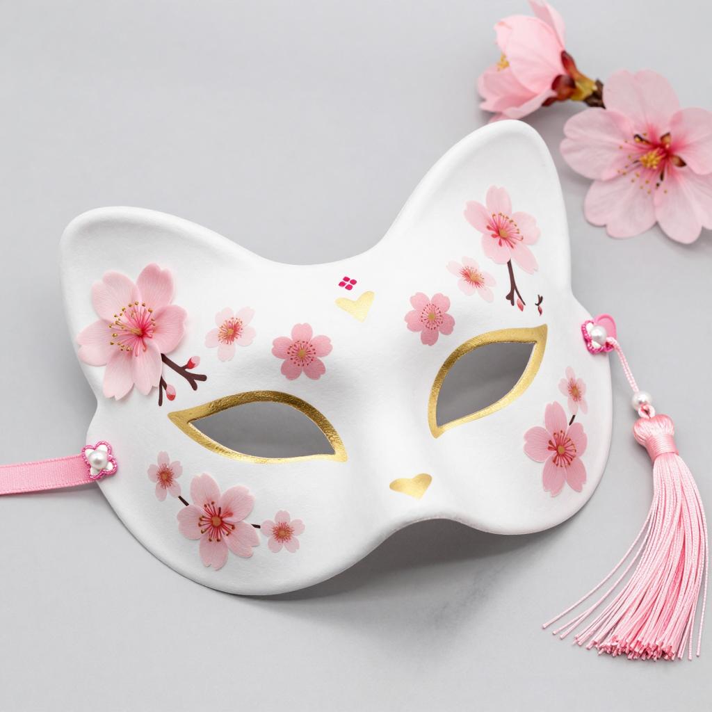 White fox mask with pink cherry blossom patterns and gold accents. Pink flower on left side, pink tassel on right. Marble background. Cat's face visible through mask openings. Mask positioned in center, slightly tilted forward.