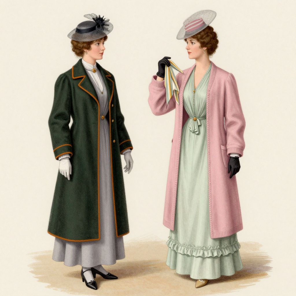 Illustration showcasing two women in elegant day wear fashion from 1910-1912, featuring detailed attire including a dark green coat with orange trim and a light gray dress worn by the woman on the left, and a pastel pink cardigan over a pale green gown with ruffled hem and a striped scarf held by the woman on the right, both accessorized with hats and gloves.