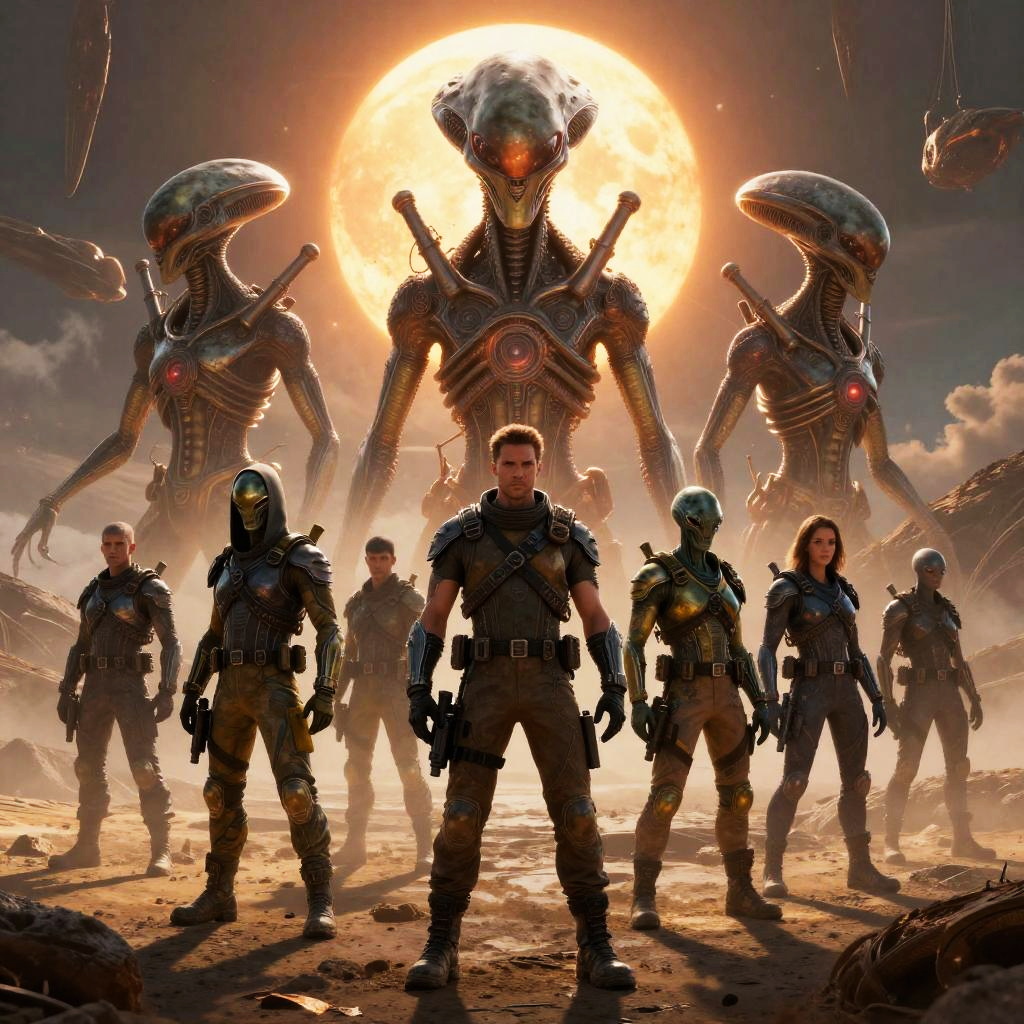 Aliens vs humans standoff on a desolate alien planet, advanced alien technology glowing, rugged human soldiers with armor, dramatic sky with two suns, vivid details, cinematic science fiction art