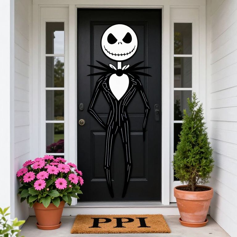 Halloween-themed entryway featuring a black front door decorated with a large silhouette of Jack Skellington, flanked by vibrant pink potted flowers on the left and a tall green plant in a terracotta pot on the right, with a gold doormat reading \"PPI\" placed below.