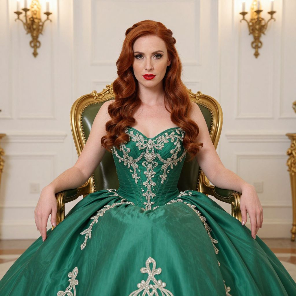 Photograph of a fair-skinned woman with long, wavy red hair sitting in a grand, gold-framed, green leather chair. She's wearing a strapless, emerald green ball gown adorned with intricate silver embroidery. Her red lipstick matches her hair, and she has a confident, slightly serious expression. The background features elegant, ornate white walls and classical lighting fixtures.