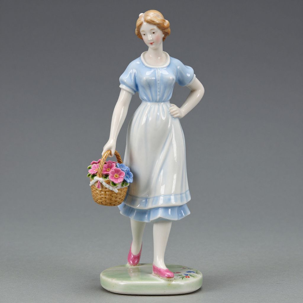 Photograph of a detailed ceramic figurine of a young woman with short red hair, wearing a light blue short-sleeved blouse and a white apron dress that reaches her knees, accented with a blue ruffle at the hem. She holds a wicker basket filled with pink, blue, and red flowers in her right hand and stands on a green circular base. She wears pink shoes. The figurine has a pale complexion and a gentle, serene expression. The background is a plain, gradient gray, emphasizing the figurine. The style is realistic with a slight vintage charm.