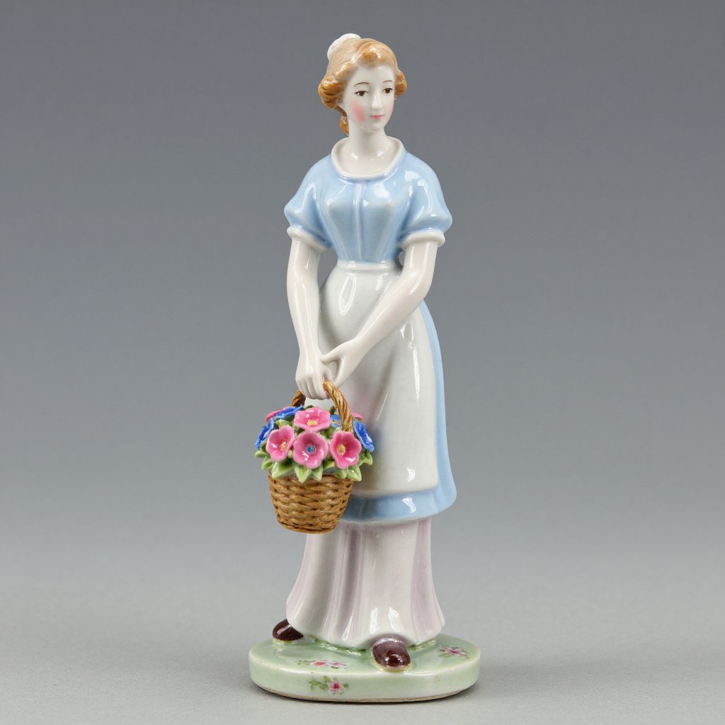 Photograph of a porcelain figurine of a red-haired woman in a blue and white dress, holding a flower basket, standing on a green base.