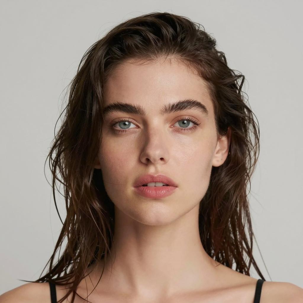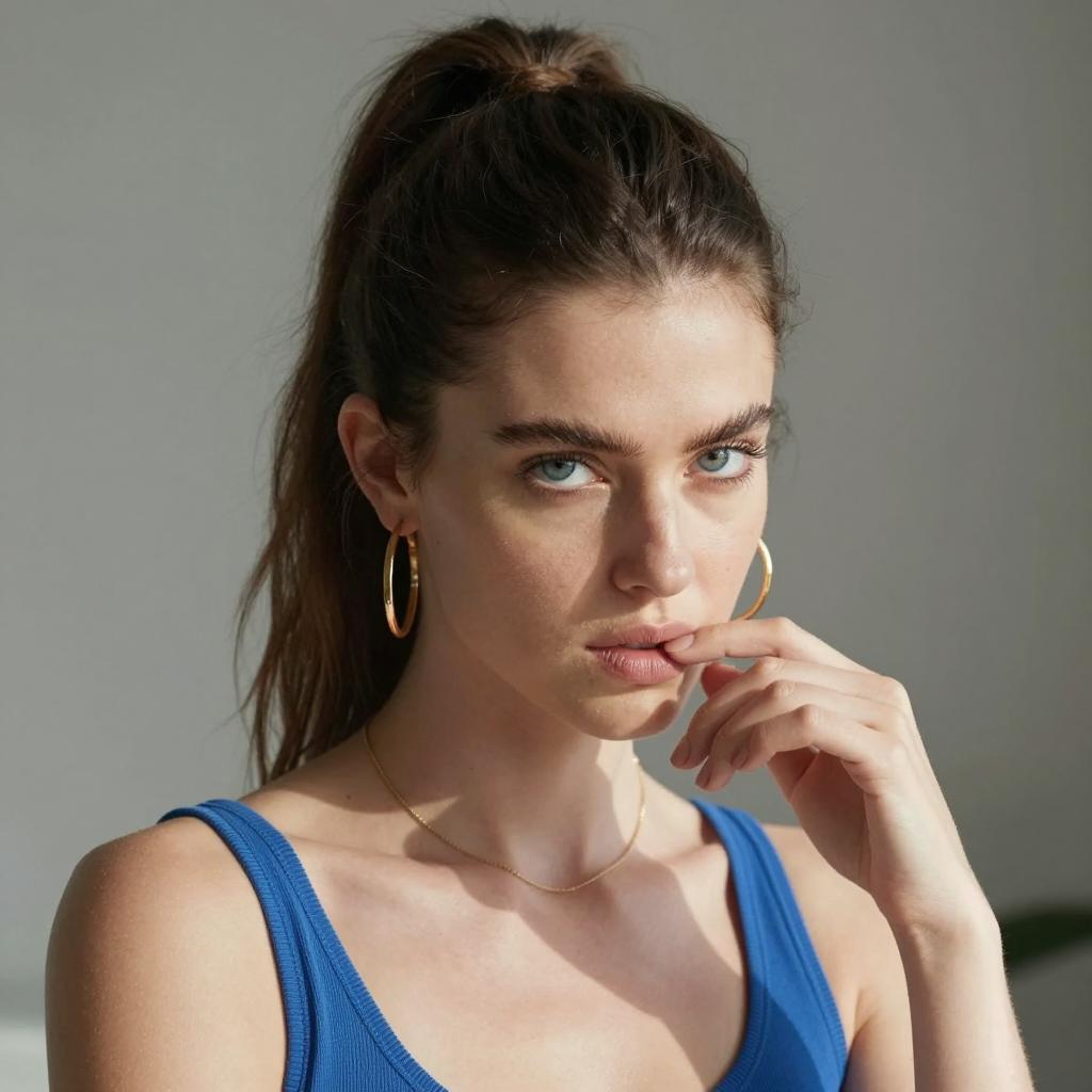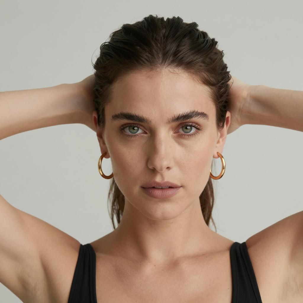 Close-up photograph of a woman with light skin, green eyes, and dark brown hair slicked back. She wears gold hoop earrings and a black strap top. Arms raised, hands resting on head. Neutral background. Intense, direct gaze.