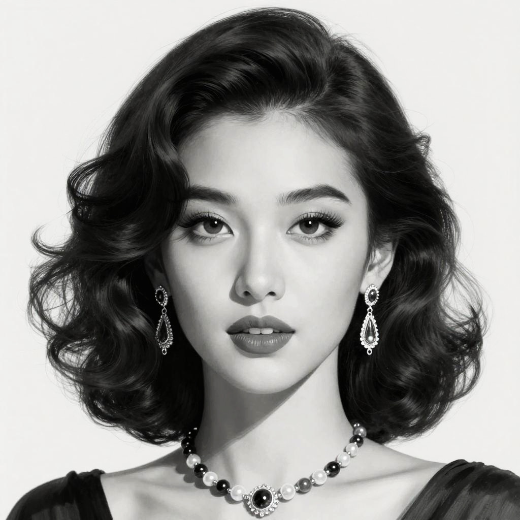 This detailed black and white digital illustration features a woman with elegant, voluminous hair styled in soft waves. Her expressive eyes, full lips, and intricate jewelry, including dangling earrings and a beaded necklace, create a classic and sophisticated portrait with a polished, high-contrast finish.