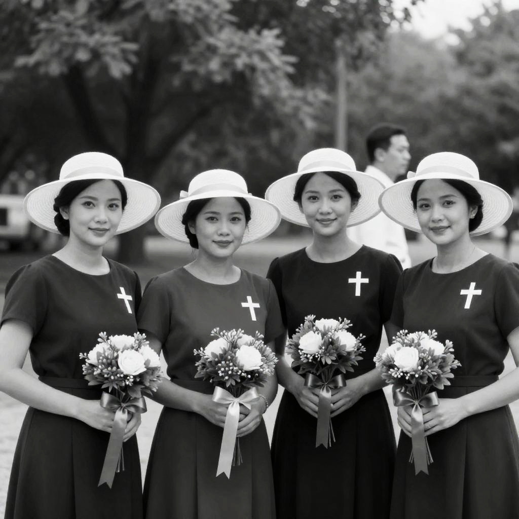 Black and white photograph of four young Asian women standing outdoors during daytime. They wear dark dresses with white crosses on the chest and wide-brimmed white hats. Each woman holds a floral bouquet decorated with a ribbon. The background features blurred trees and a man walking by.