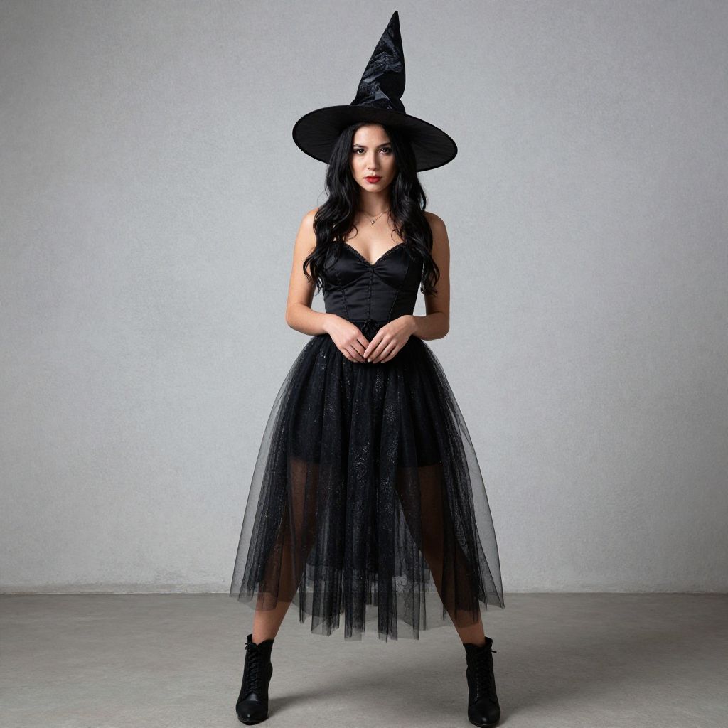 Photograph of a fair-skinned woman with long, wavy black hair wearing a tall, pointed black witch hat and a black, sleeveless, V-neck dress with a tulle skirt that reaches mid-thigh. She stands confidently with hands clasped in front, wearing black ankle boots. The background is a plain, light gray studio wall and floor, emphasizing her gothic, Halloween-themed attire. Her red lipstick stands out against her pale complexion and dark outfit. The overall style is modern and edgy, with a focus on dark, mystical fashion.