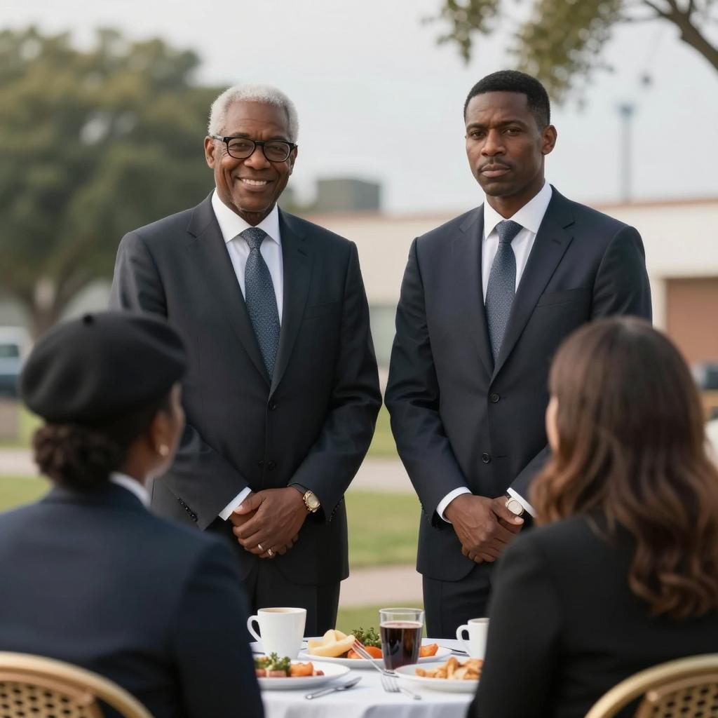 Two Black men in dark suits and ties, one with white hair and glasses, the other with short black hair, stand outdoors. One man smiles, the other looks serious. One Black woman in a black beret sits on the left, back to camera. One woman with long brown hair, back to camera, sits on the right. Table with food and cups in foreground. Trees and blue sky in background. All standing and sitting in casual outdoor setting. Three people in total.