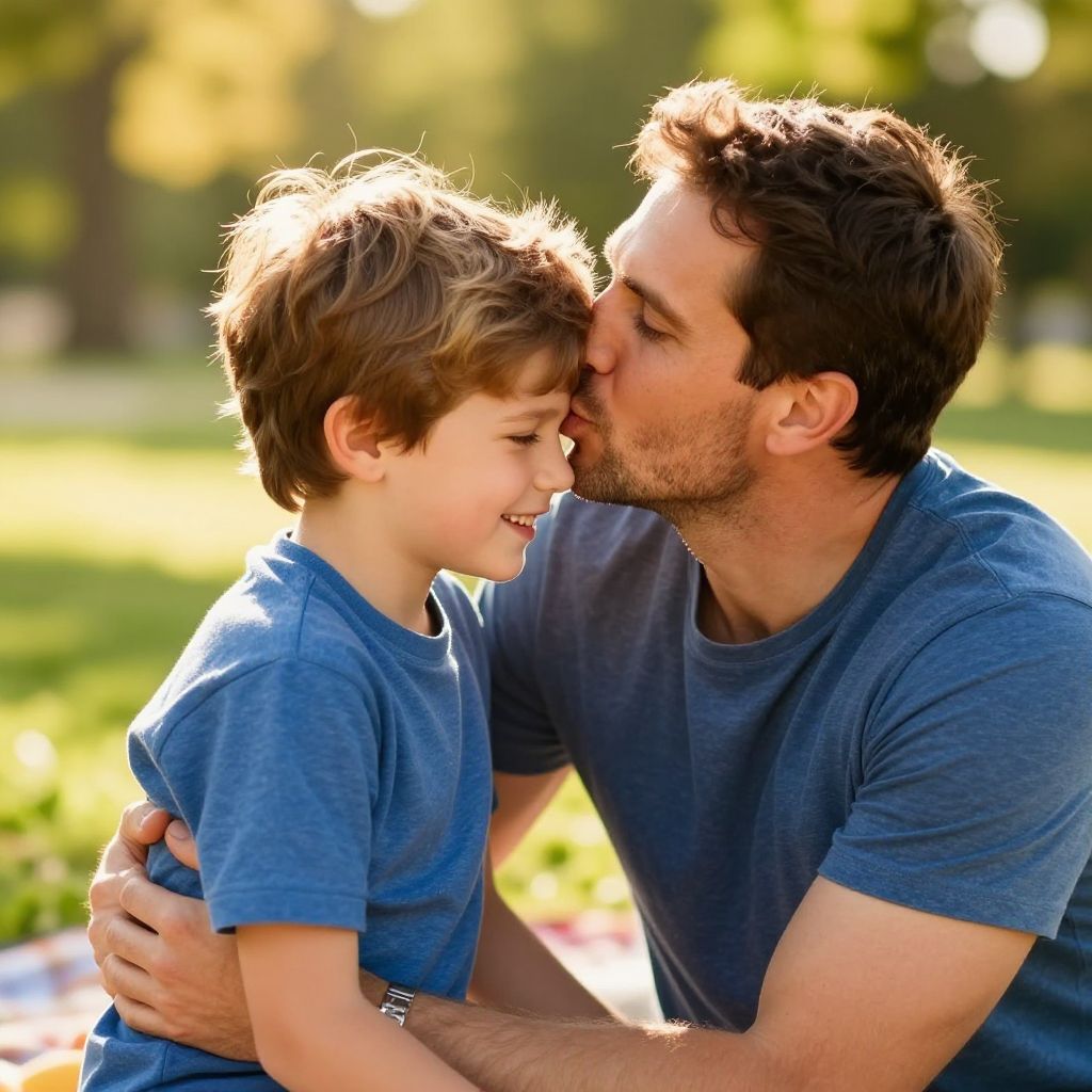 Dad kissing son gently on forehead during a sunny park picnic, warm golden light, joyful expressions, candid family moment, soft-focus background, vibrant colors