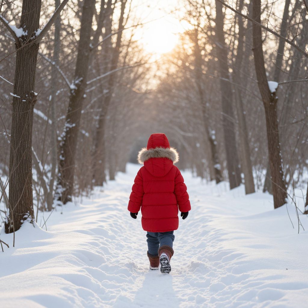 Child walks forward through a serene winter forest, their red puffer coat contrasting against the snow-covered ground and bare trees, as the sun casts a warm glow above.